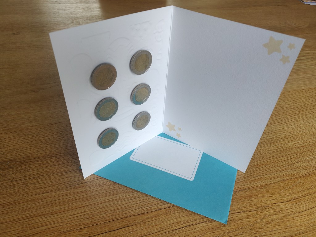 Een verjaardagskaart gevonden en 6 munten van 2 euro met dubbelzijdige plakkers in de kaart geplakt.
