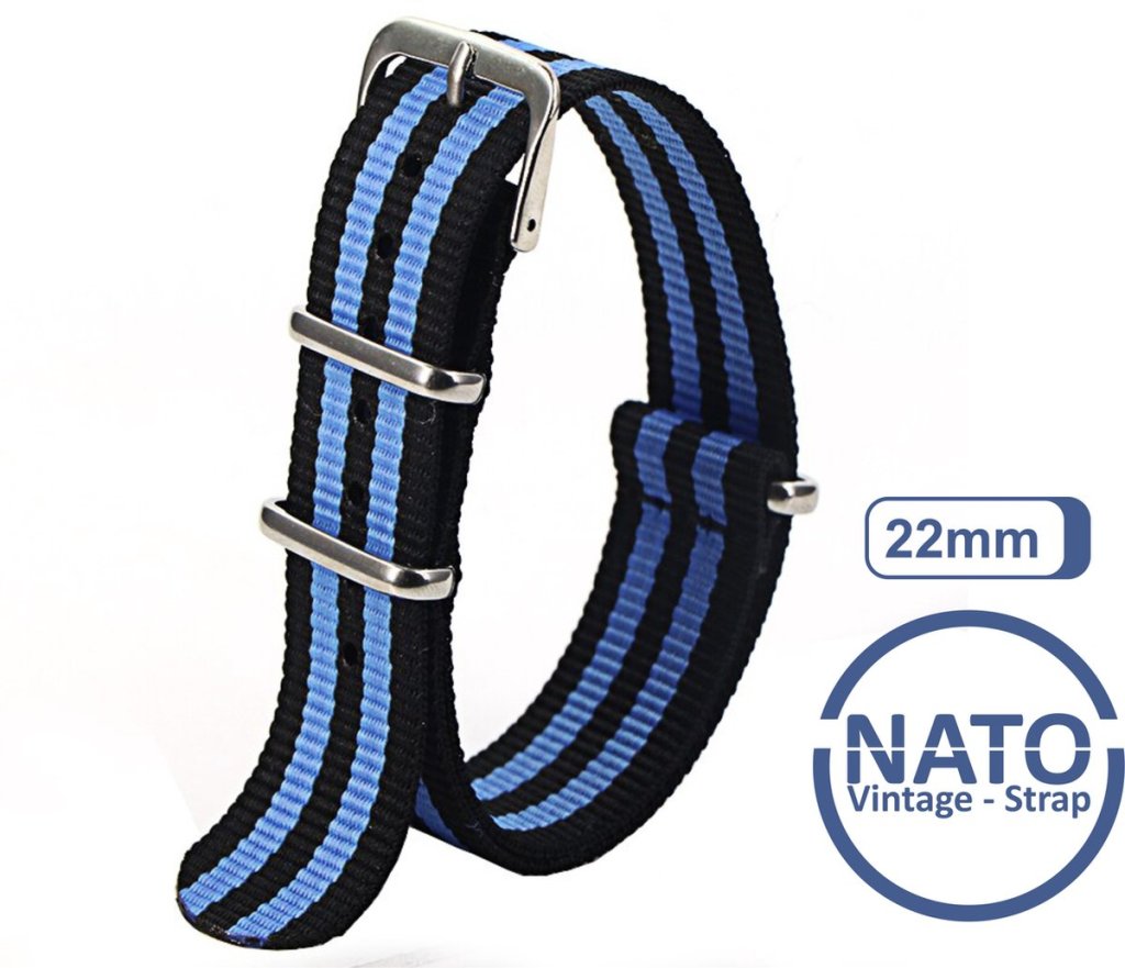 De zwart met blauwe gestreepte nato horlogeband zal goed combineren met de blauw met zwart gekleurde draaischijf.