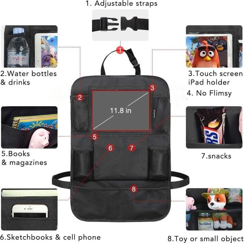 Bij een lange rit is het fijn als iedereen achterin de auto zijn spullen makkelijk kwijt kan. Dat er een scherm in zit voor de tab/telefoon is mooi meegenomen.
